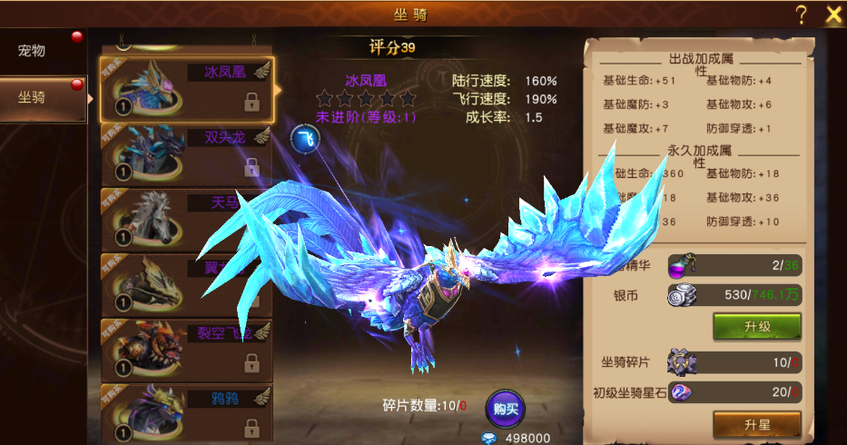 坐騎:每只坐騎都會(huì)為玩家?guī)砩?、物防、魔防、物攻、攻、防御穿透的屬性提升,坐騎品質(zhì)越高,提升越大。玩家可通過坐騎的升級以及升星來提升坐騎的屬性。