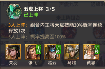 黃忠搭配張飛,劉備,趙云就可以湊齊五虎上將組合,三五虎上將會(huì)有30%的概率將天賦技能連續(xù)釋放一次!